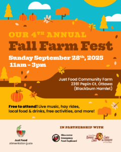 Fall Farm Fest 2025 – EVERYONE WELCOME! In partnership with: Gloucester Emergency Food Cupboard and the Eastern Ottawa Resource Centre Join us this Sunday, September 28th, 2025 from 11am-3pm at the Just Food Community Farm for our 4th annual Fall Farm Fest,located on unceded, unsurrendered